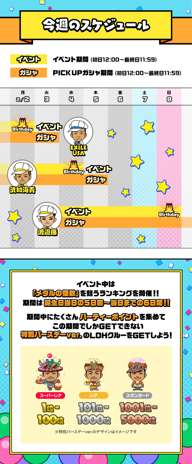 LDH mobile マイページ 2026.02.02 【LDH mobileマイページ】 MEMBER BIRTHDAY PARTY 今週のイベントラインナップ ※オリジナル画像は、メンバーのバースデー前日の12:00から当日の11:59までダウンロードすることができます。