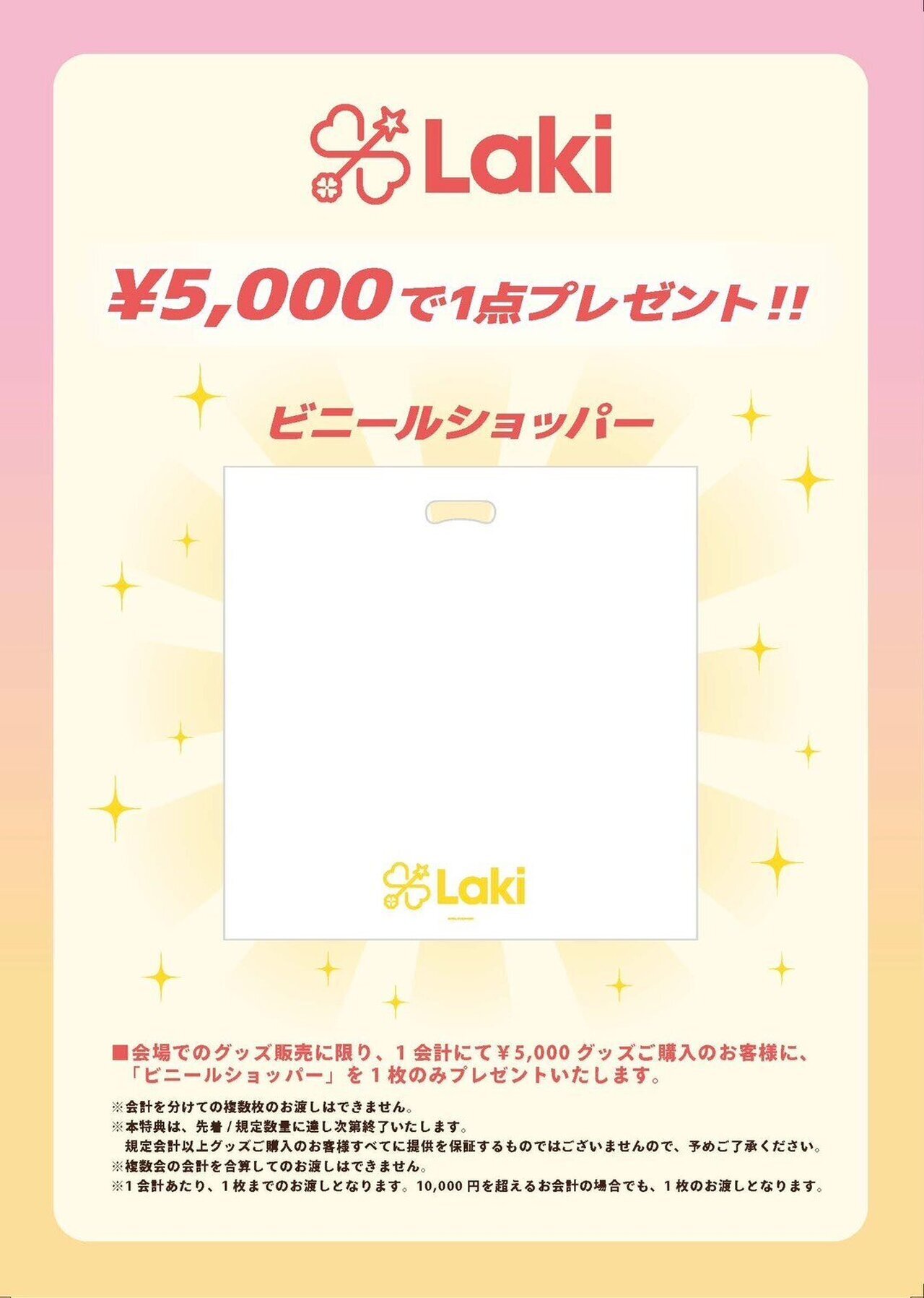 ■1会計にて5,000円以上グッズご購入のお客様に、「Lakiロゴショッパー」を1枚プレゼントいたします。