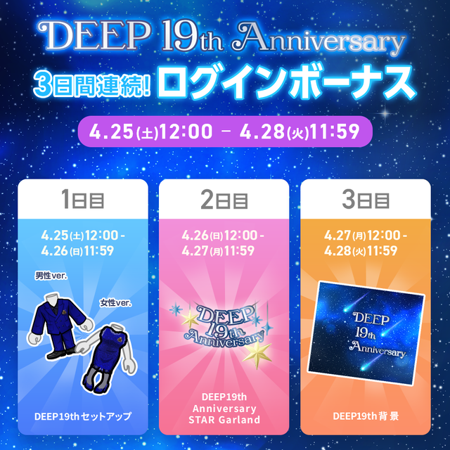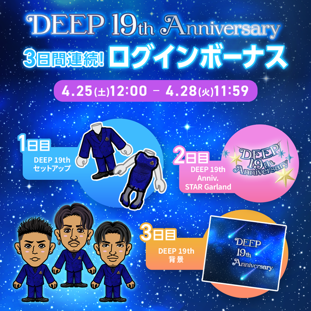 LDH mobileマイページでは、DEEP 19th Anniversaryを記念して『3日間連続ログインボーナス』を開催いたします!!