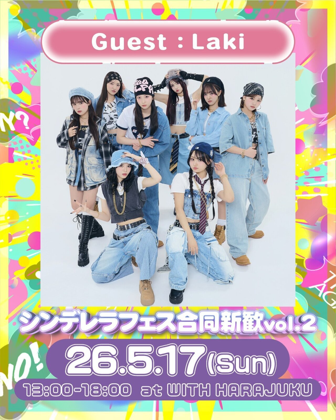 Laki 2026.04.23 【Laki】5/17(日)開催『シンデレラフェス合同新歓vol.2』に出演! 5/17(日)にWITH HARAJUKU HALLで開催される、『シンデレラフェス合同新歓vol.2』にLakiの出演が決定しました! 当日のパフォーマンスをお楽しみに!! 是非チェックしてください! 『シンデレラフェス合同新歓vol.2』 【日程】 2026/5/17(日)13:00〜18:00 【会場】 WITH HARAJUKU HALL ※来場対象15歳〜22歳の女子限定 ※入場料:無料 ※事前予約が必須です。